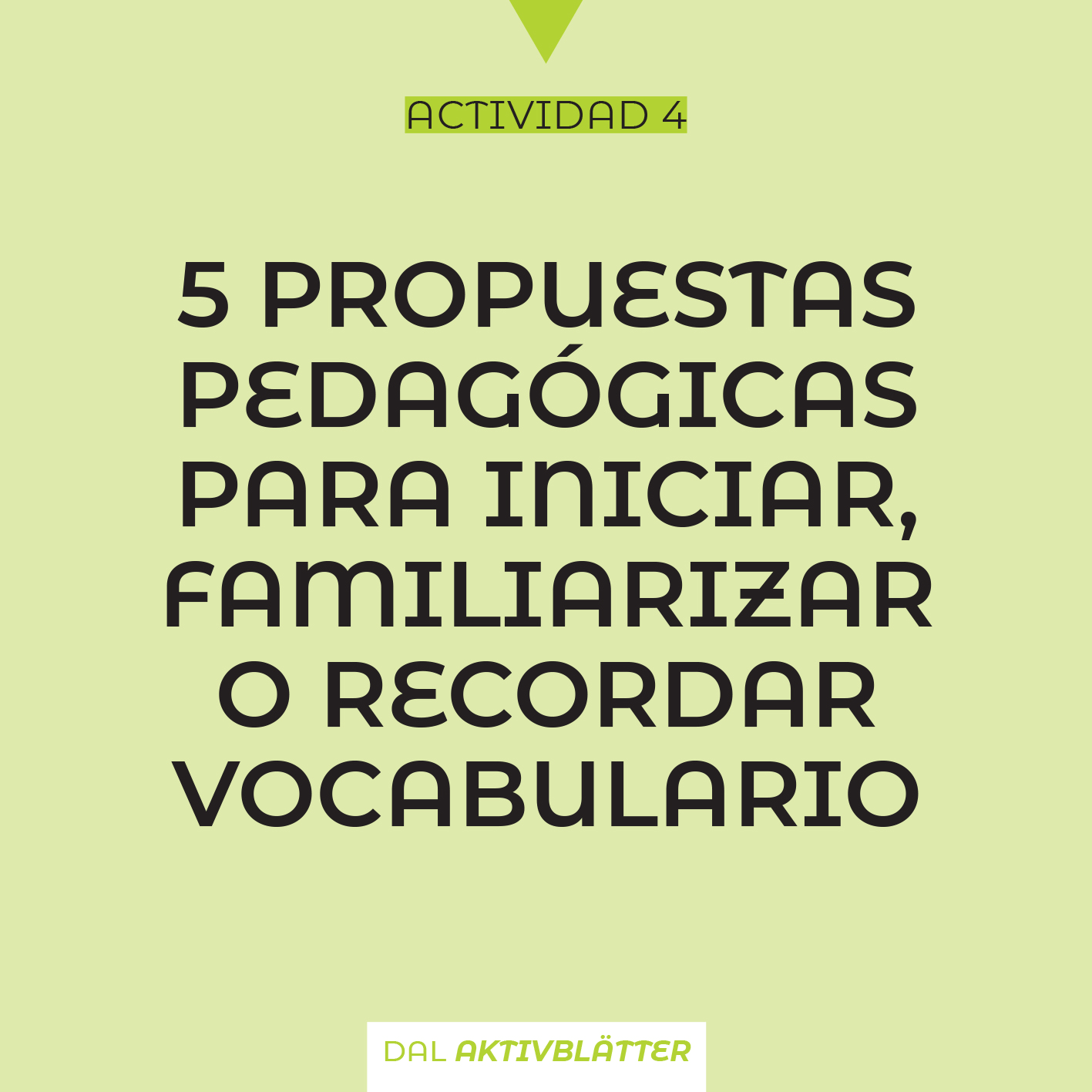 Actividades En esta sección te encontrarás con ideas, actividades y recursos didácticos prácticos para todas las edades. Todos somos amigos Conocer más Wo ist die kleine Maus? (¿Dónde está el pequeño ratón?) Conocer más Alfombras misteriosas Conocer más Hokus Pokus | Actividad 5 Conocer más 5 propuestas pedagógicas para iniciar, familiarizar o recordar vocabulario | Actividad 4 Conocer más 2 propuestas pedagógicas para incorporar el vocabulario: saludos cotidianos | Actividad 3 Conocer más 2 propuestas pedagógicas para incorporar el vocabulario: saludos cotidianos | Actividad 2 Conocer más Ideas para hacer silencio con rimas | Actividad 1 Conocer más Cargar más